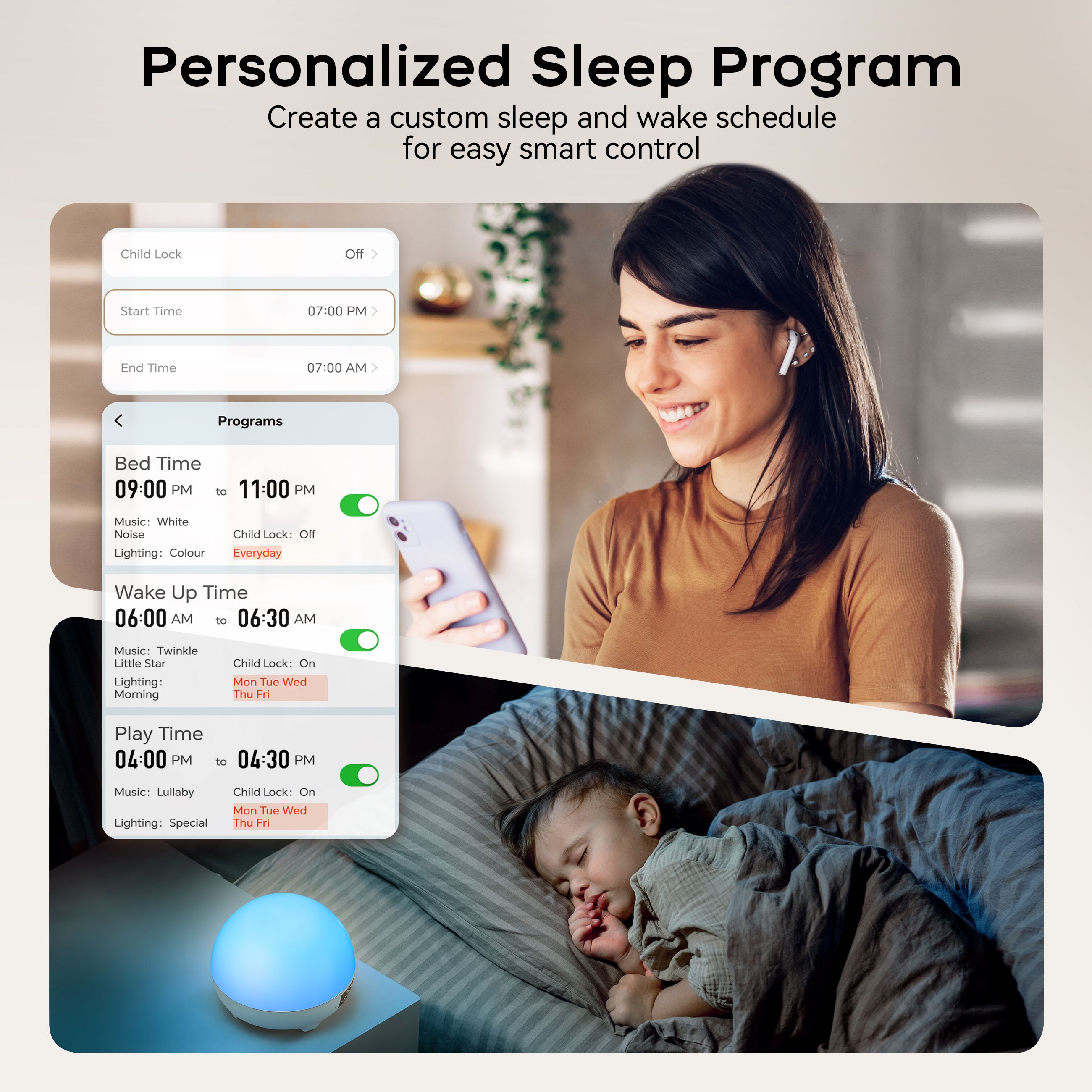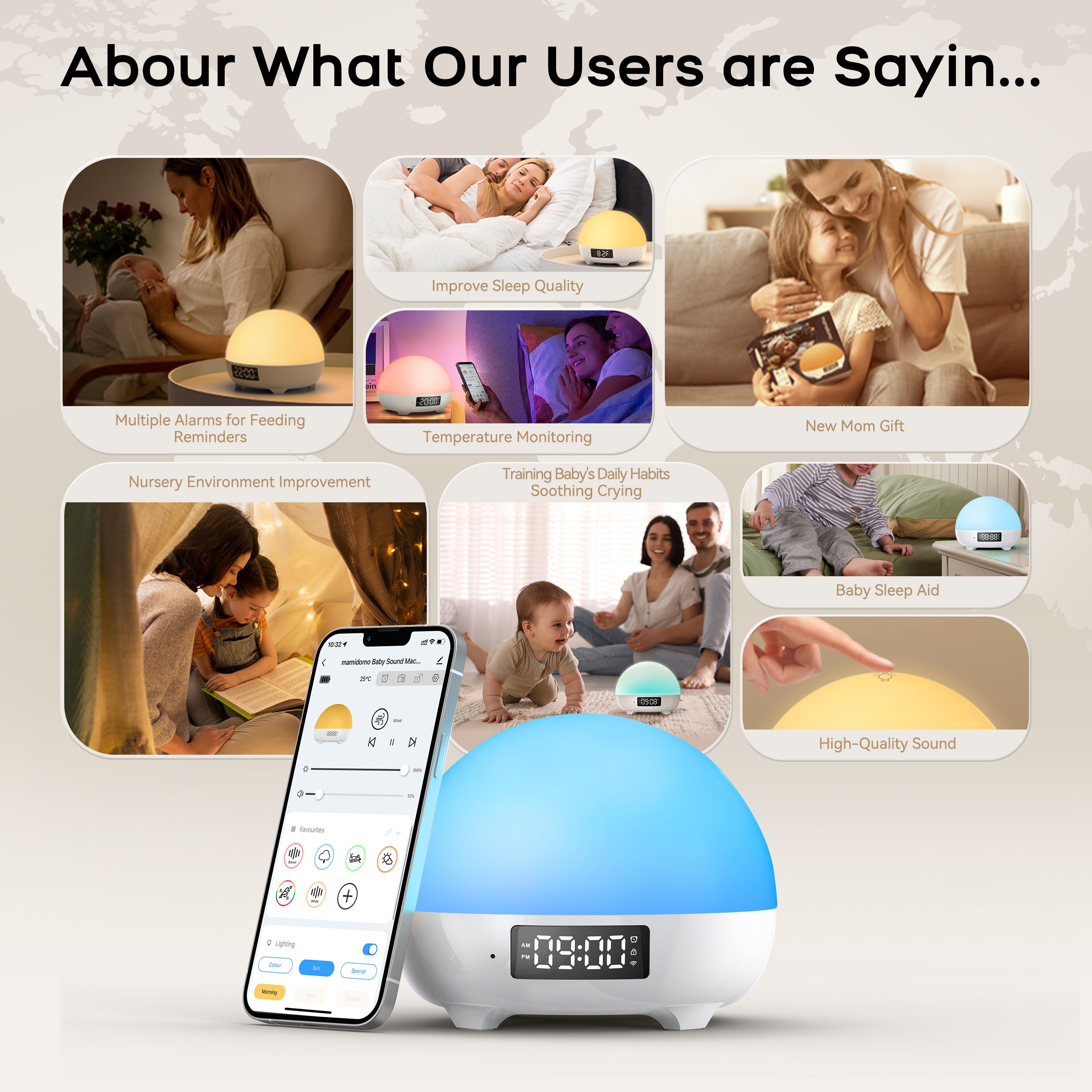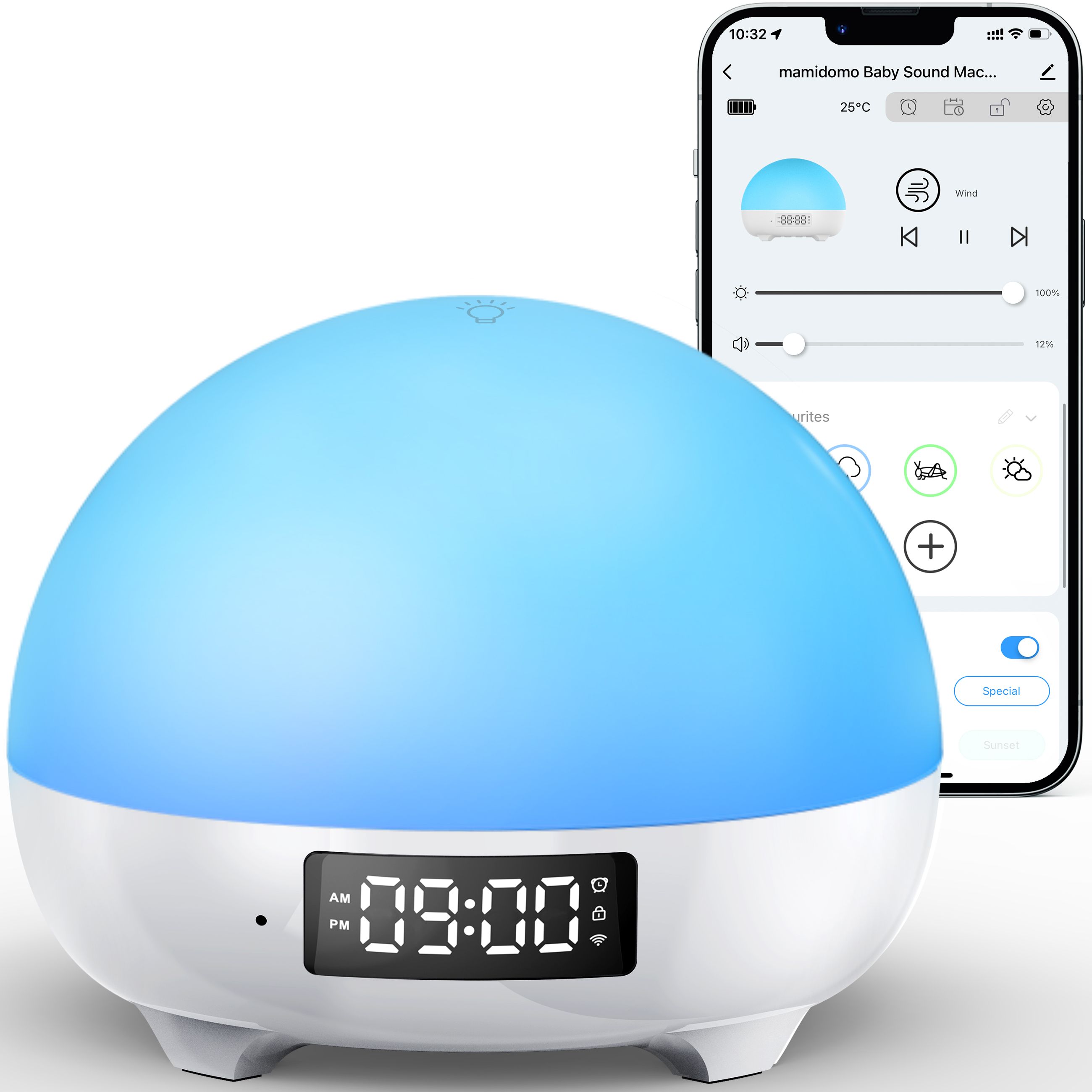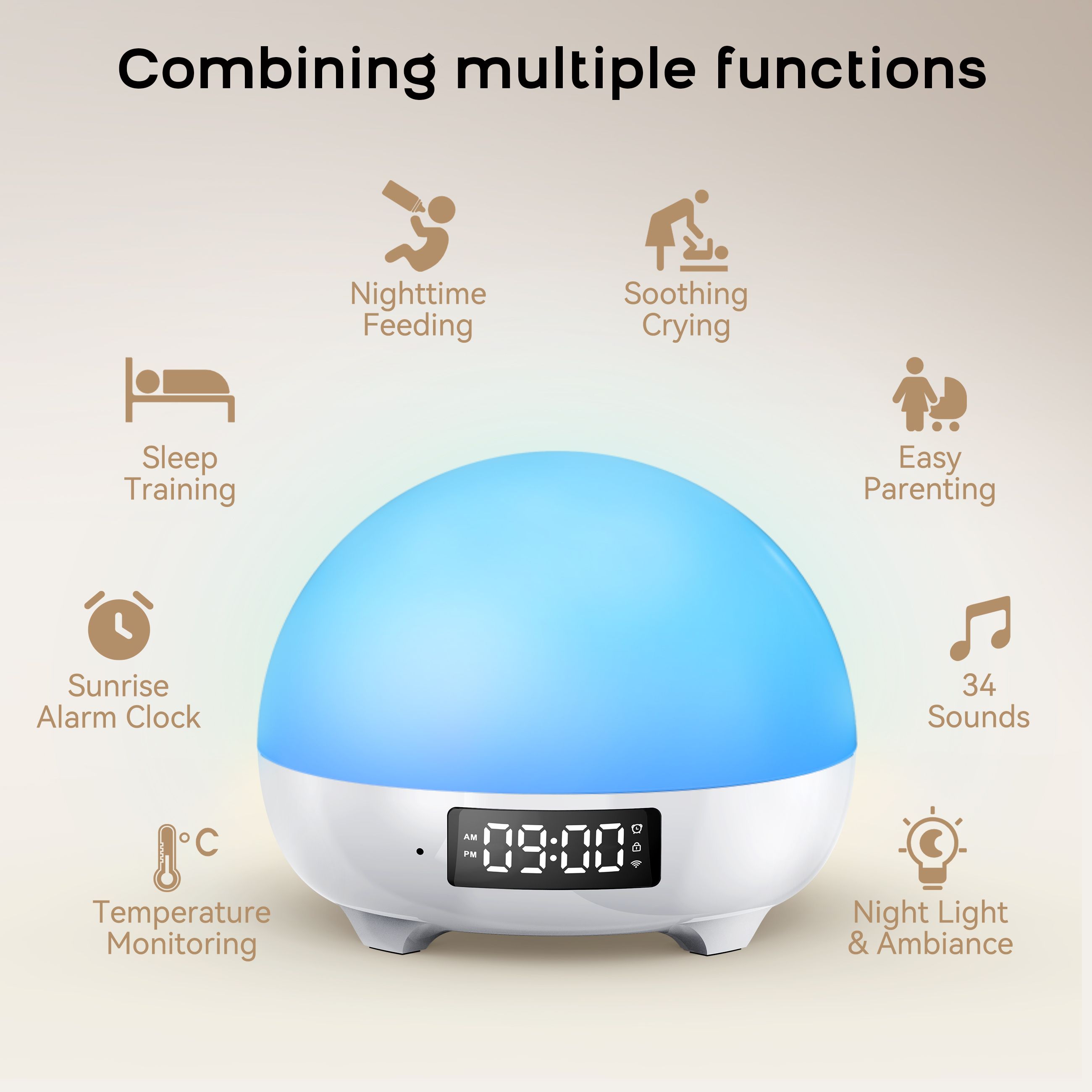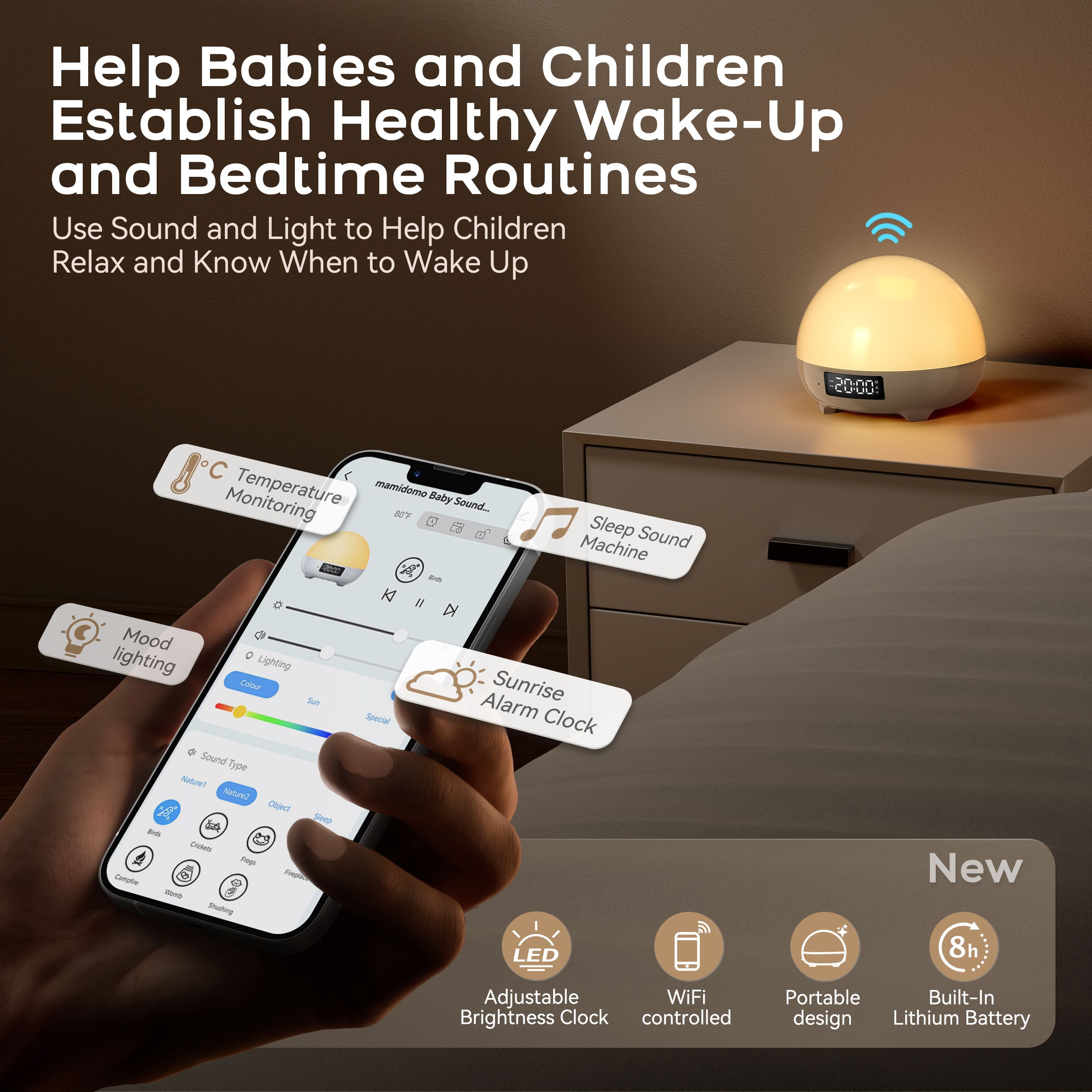 Mamidomo Sunrise Alarm Clocks White Noise Sound Machine with 34 Soothing Sounds, 11 Night Lights, Wake up Light Alarm Clock for Bedrooms, Heavy Sleepers, Temperature Monitoring for Babys, Adults, Kids